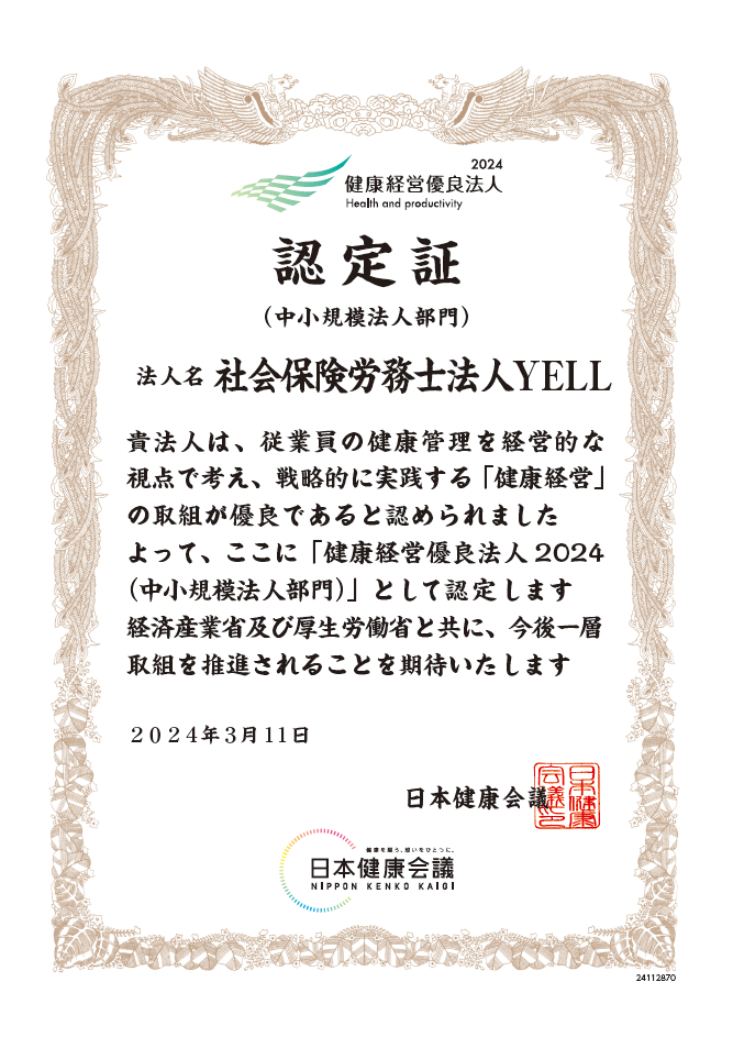 社会保険労務士法人 YELLは、健康経営に取り組む企業として、経済産業省による「健康経営優良法人2024」に認定されました。
