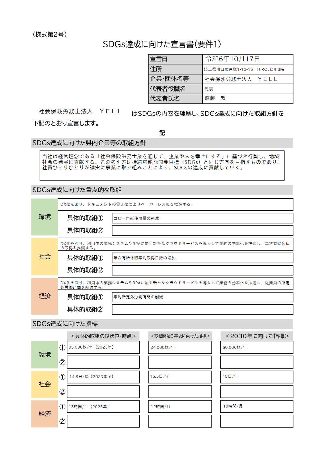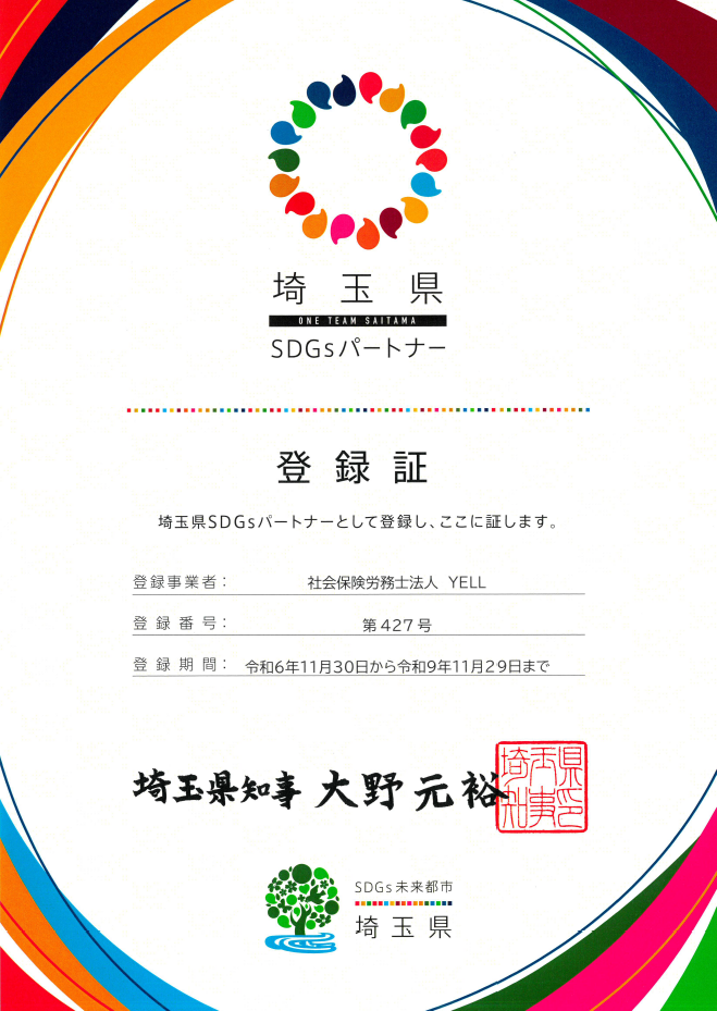 社会保険労務士法人 YELLは、SDGsの取組を自ら実施・公表する企業として、令和3年11月30日に埼玉県より「埼玉県SDGsパートナー」に登録されました。 3年間の認定期間を終え、再度申請を行い、この度、登録を更新していただきました。